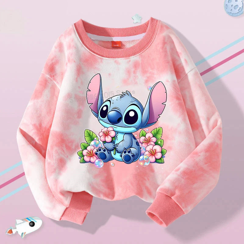 Lilo Stitch Tie-dyed Sweatshirt for Girl Purple Pullover Crew Neck Child Sportwear Long Sleeve Cute Cartoon Kids Autumn Clothes