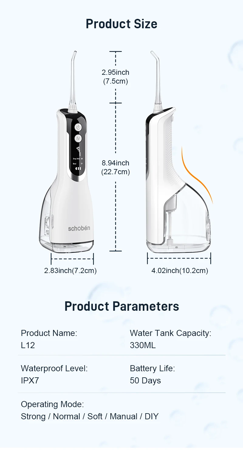 Experience professional-level oral hygiene at home with the Schoben L12 Portable Water Flosser. Designed for adults, this USB-C rechargeable oral irrigator offers multiple cleaning modes and a large water tank for an effortless, refreshing clean.
