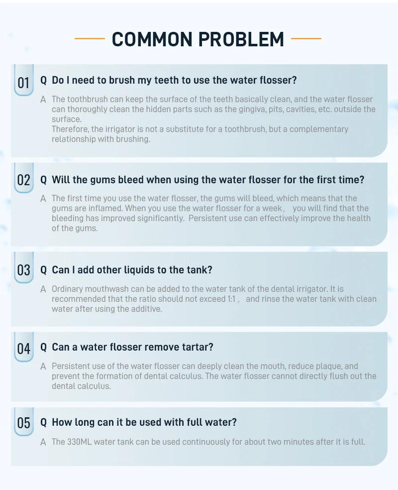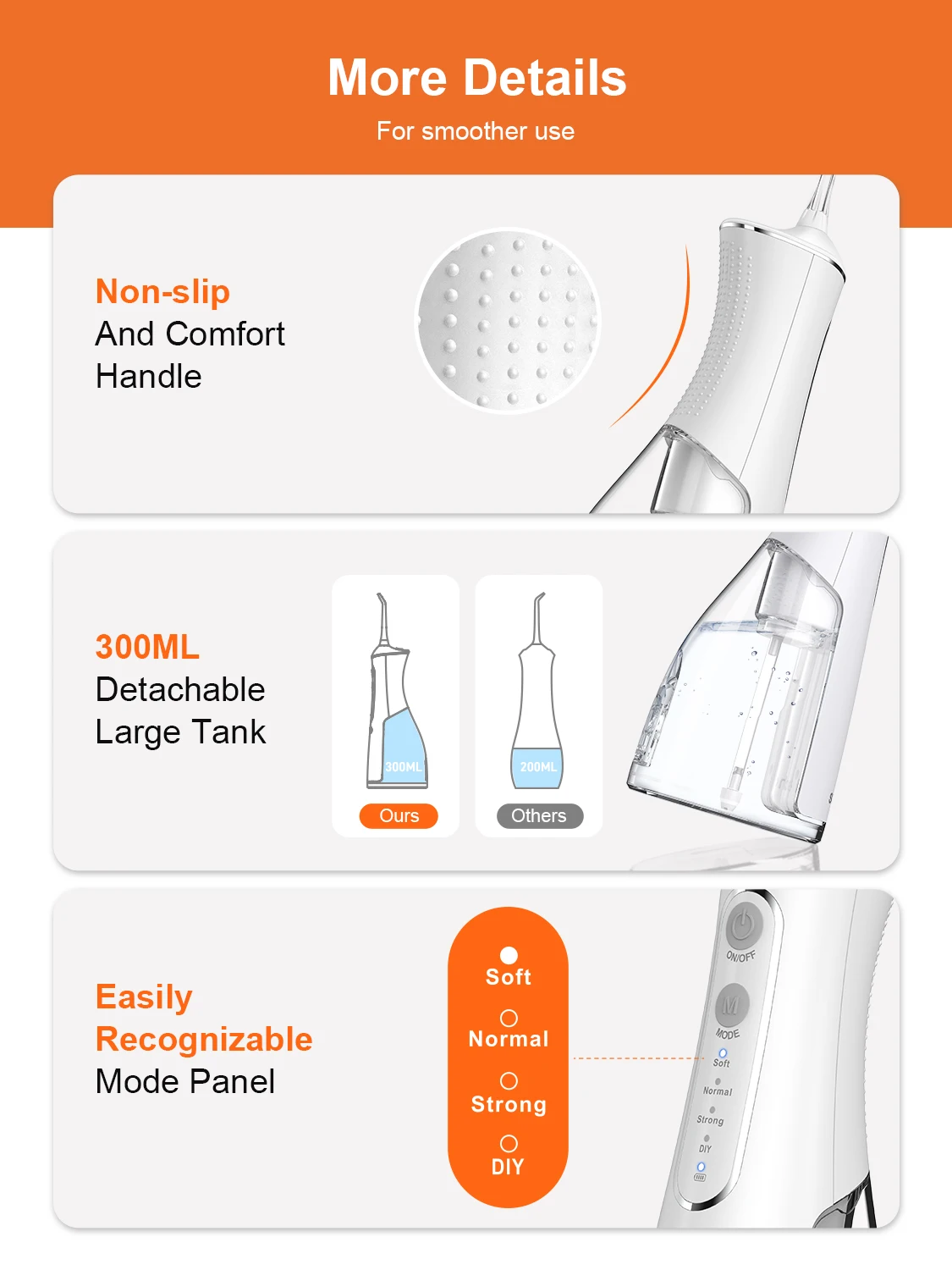 - Large Water Tank: 330ml capacity for longer flossing sessions without refills.